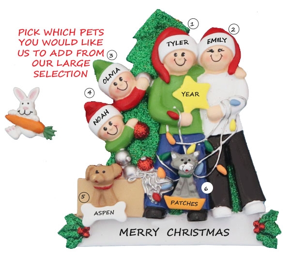 This personalized Christmas ornament is a perfect keepsake for a family that enjoys decorating the Christmas tree together. Now, we have even included the family pets!  We are happy to hand personalize, creating a unique and thoughtful gift. This is sure to become a special keepsake to treasure for years to come.  This lovely Ornament comes with ribbon ready to hang right out of the package.
