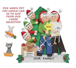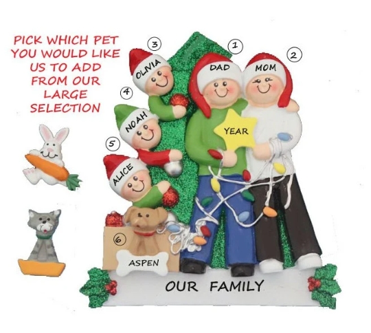 This personalized Christmas ornament is a perfect keepsake for a family that enjoys decorating the Christmas tree together. Now, we have even included the family pet! We are happy to hand personalize, creating a unique and thoughtful gift. This is sure to become a special keepsake to treasure for years to come. This lovely Ornament comes with ribbon ready to hang right out of the package.