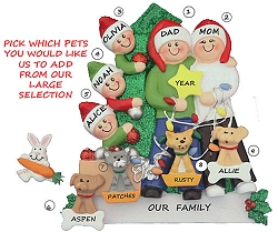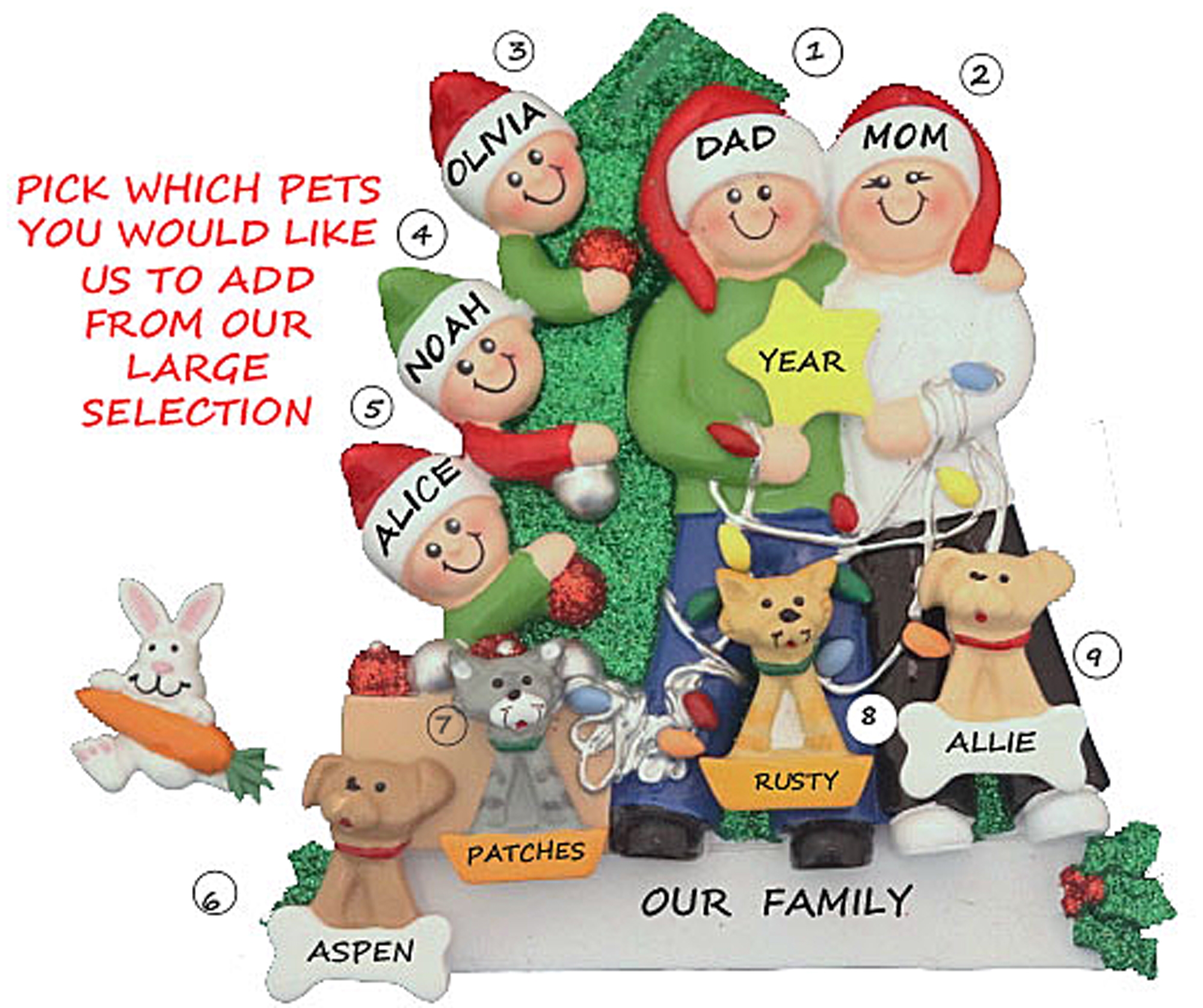 This personalized Christmas ornament is a perfect keepsake for a family that enjoys decorating the Christmas tree together. Now, we have even included the family pets! We are happy to hand personalize, creating a unique and thoughtful gift. This is sure to become a special keepsake to treasure for years to come. This lovely Ornament comes strung on red ribbon, ready to hang right out of the package.