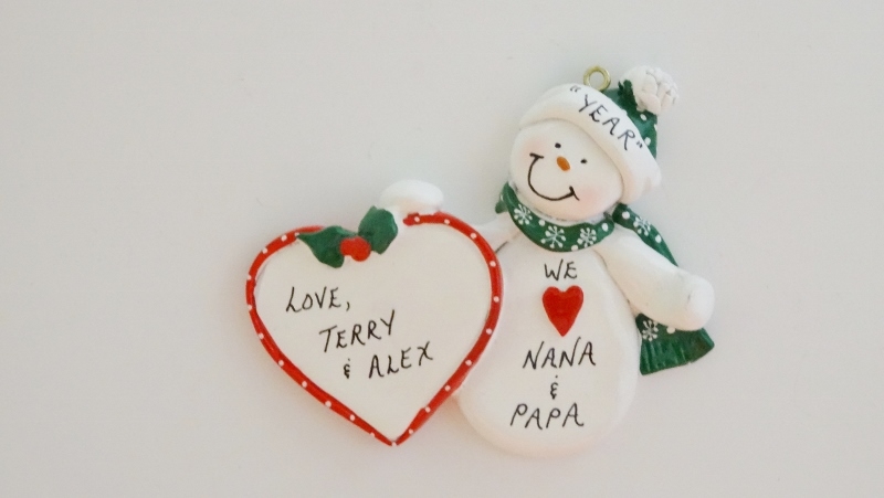 Our adorable Snowman is holding a big heart to tell special Grandparents how much they are loved. We can personalize this to be for 1 or both grandparents, with the names you would like. On the heart we can add who it is from. This is sure to become a keepsake that they will treasure for many years. Ornament comes with ribbon ready to hang.