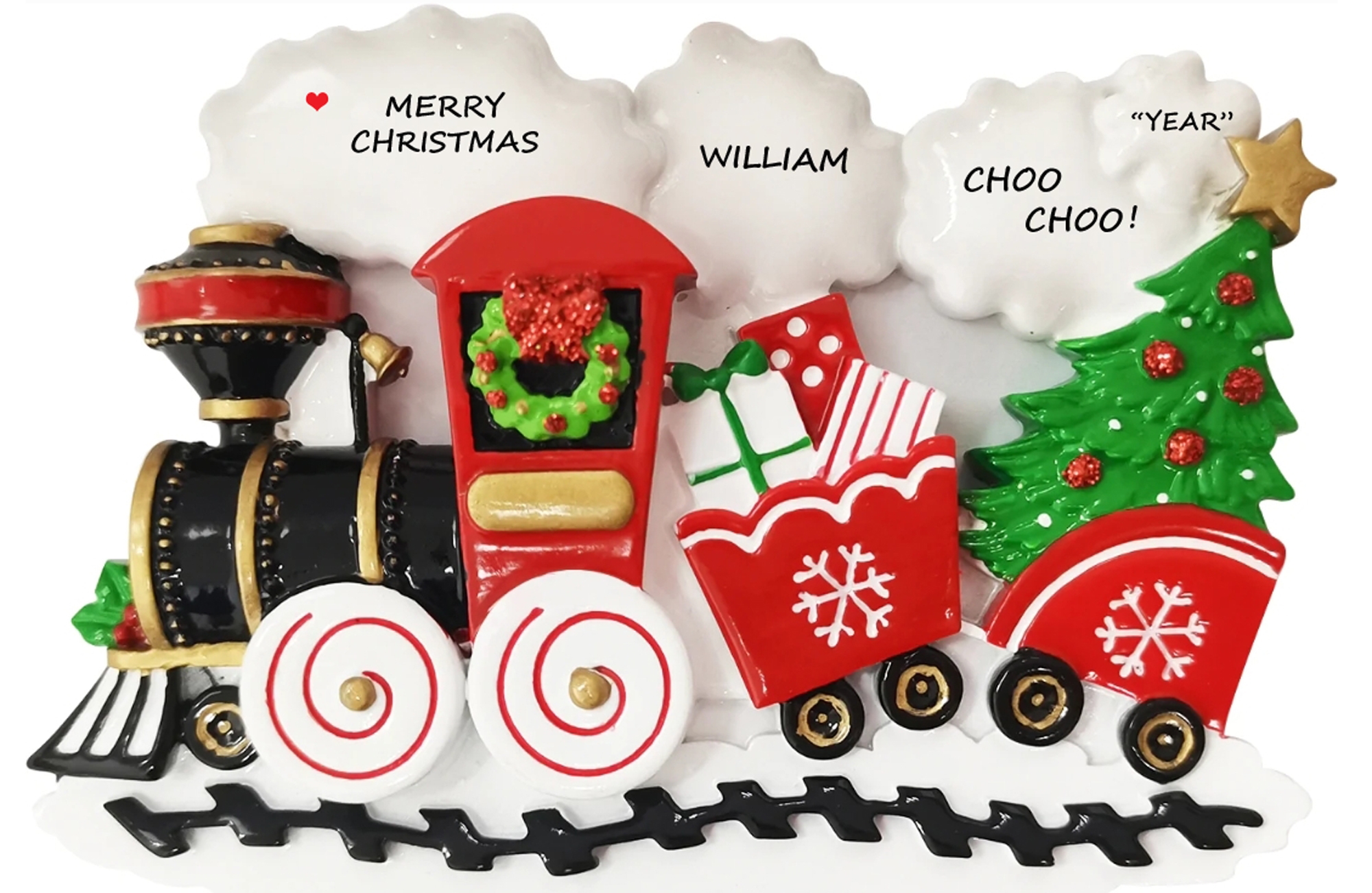 This adorable train can be personalized to capture a special Christmas. Hand painting and a high gloss finish make this high quality ornament bright and sturdy. We hand personalize, creating a thoughtful and unique gift. It's a wonderful present that the entire family will enjoy, for many years to come. This ornament comes strung on ribbon, ready to hang right out of the package.