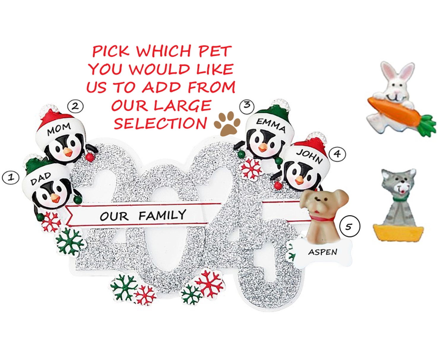 This Family of 4 Personalized Christmas ornament is perfect to remember 2025. We even included their pet! Add a dog, cat, bunny, hamster, bird or lizard pet to represent the whole family. Ornament comes with ribbon ready to hang.