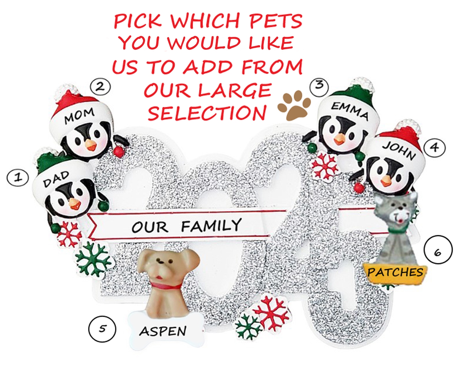 Dated 2025 Personalized Family of 4 Ornament With 2 Dogs, Cats or Bunnies Added
