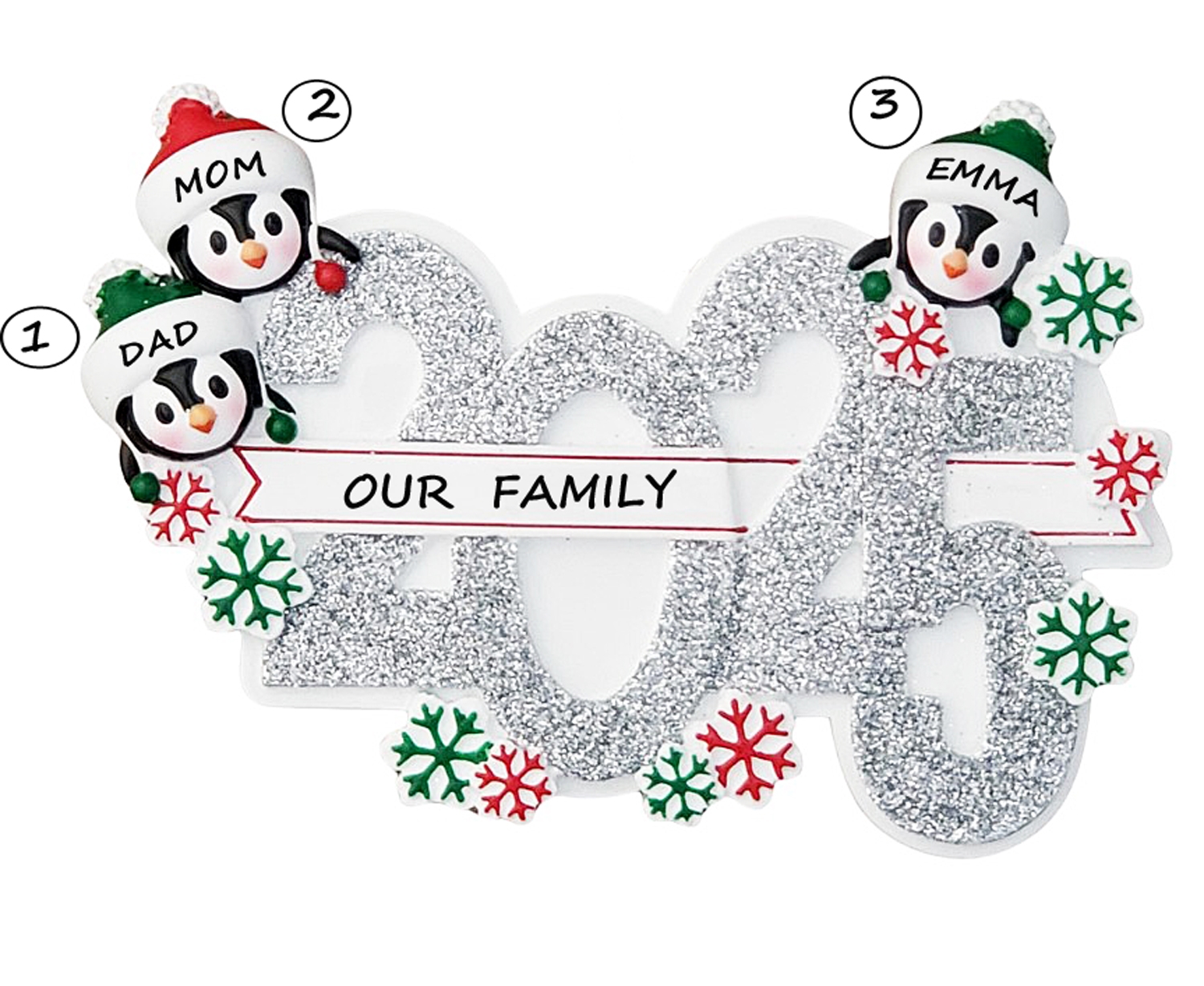 Celebrate 2025 with a Family of 3 Personalized Christmas ornament! A perfect gift to remember a special Christmas with whole Family. We will be happy to hand personalize your ornament to make this a special keepsake to treasure for years to come. Ornament comes with ribbon ready to hang.