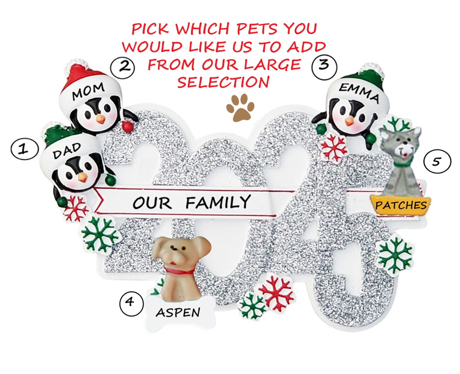 Celebrate 2025 with a Personalized dated Christmas ornament! A Year To Remember! We have even included their pets! A perfect holiday wish for that special Family of three. We will be happy to hand personalize your ornament to make this a special keepsake to treasure for years to come. Ornament comes with ribbon ready to hang.