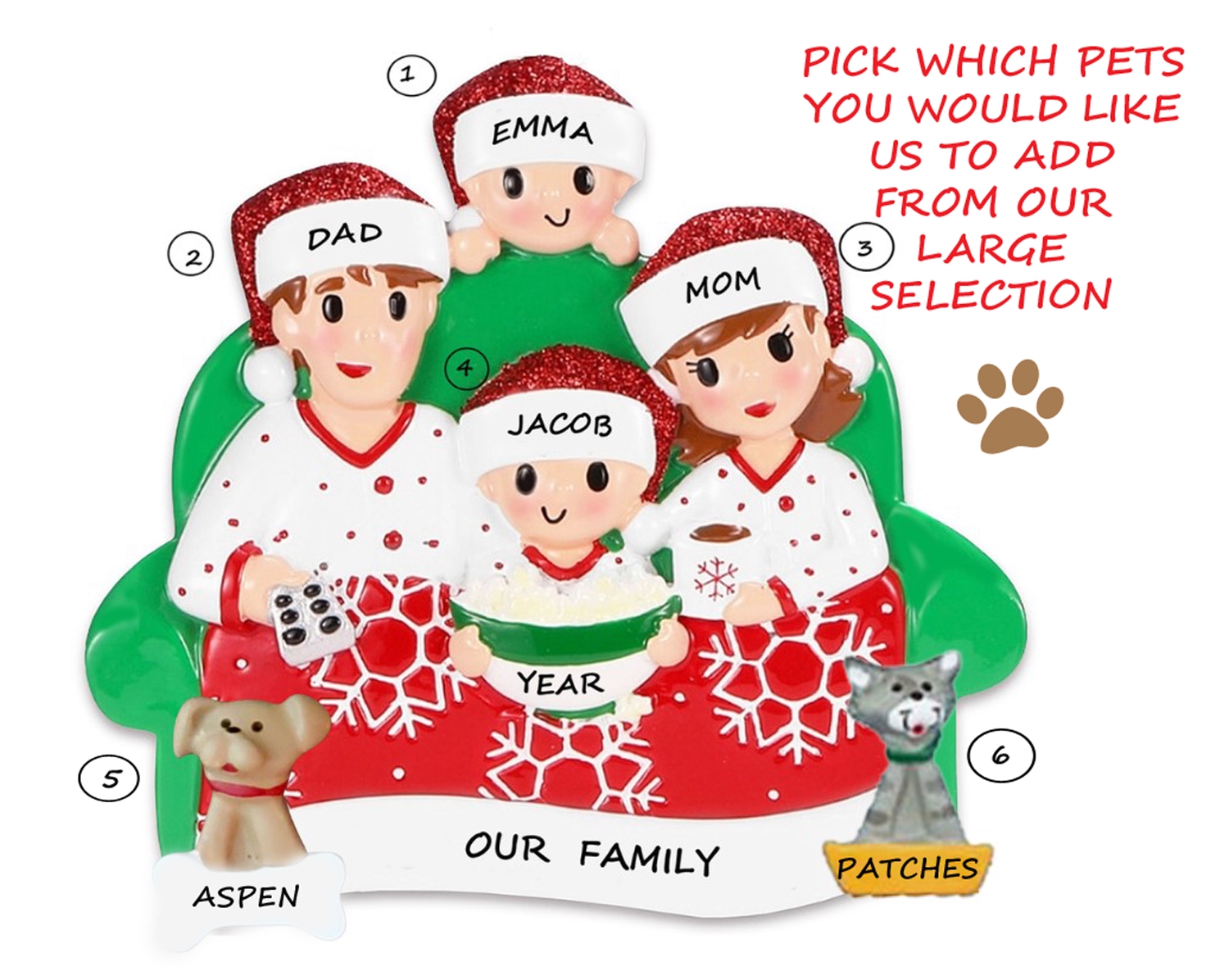 This adorable Family of 4 is snuggled on the couch watching movies and creating family memories. We have even included the family dogs or cats! Hand painting and a high gloss finish make this high quality ornament bright and sturdy. We hand personalize creating a thoughtful and unique gift. It's a wonderful present that the entire family will enjoy for many years to come. This ornament comes with ribbon ready to hang right out of the package.