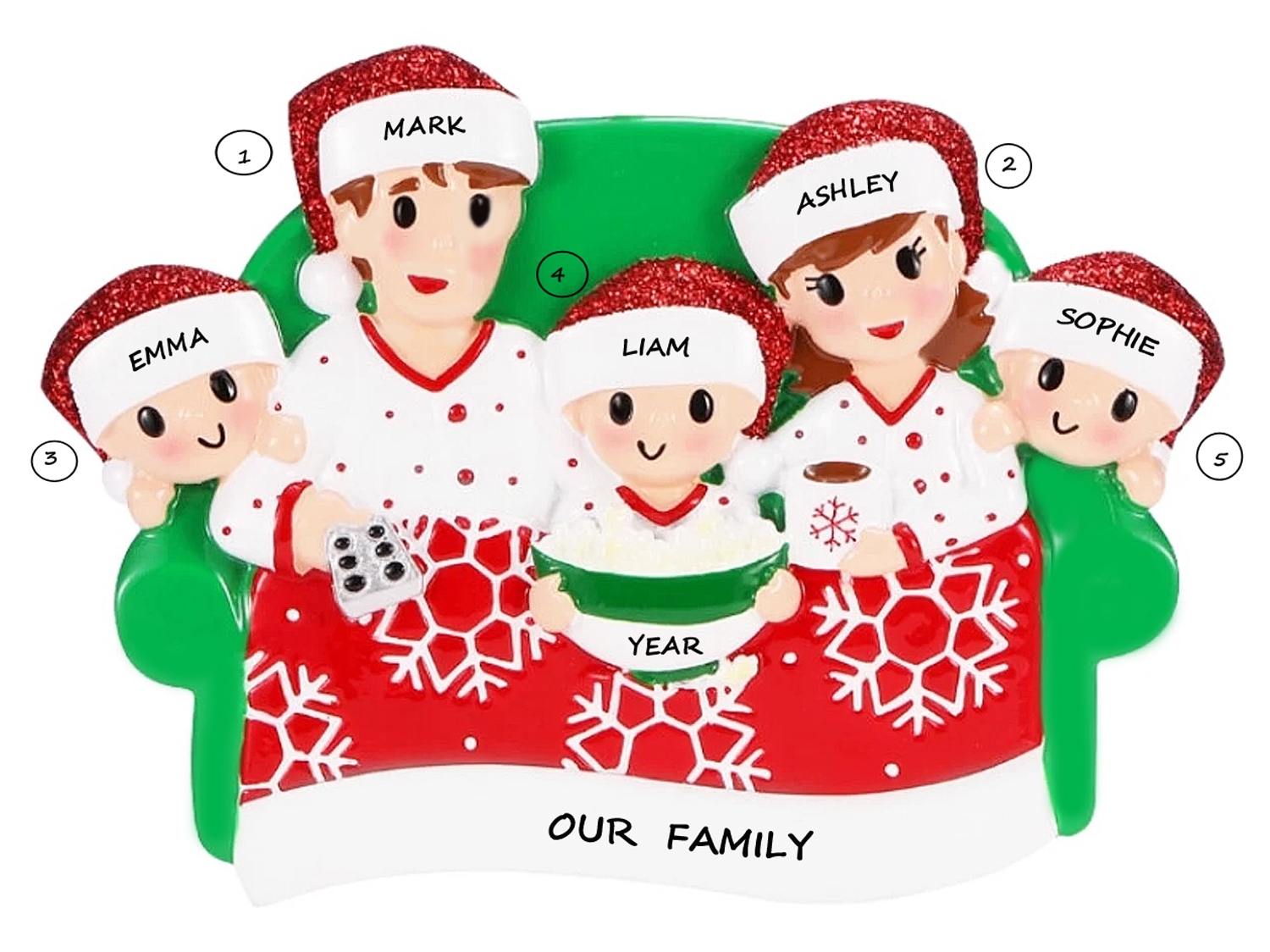 The adorable Personalized Ornament Family of 5 is all snuggled together on the couch ready to watch a show and creating family memories. A perfect ornament to add to the family Christmas tree. We can hand personalize this to make it a keepsake to remember for many years. Ornament comes with ribbon ready to hang.