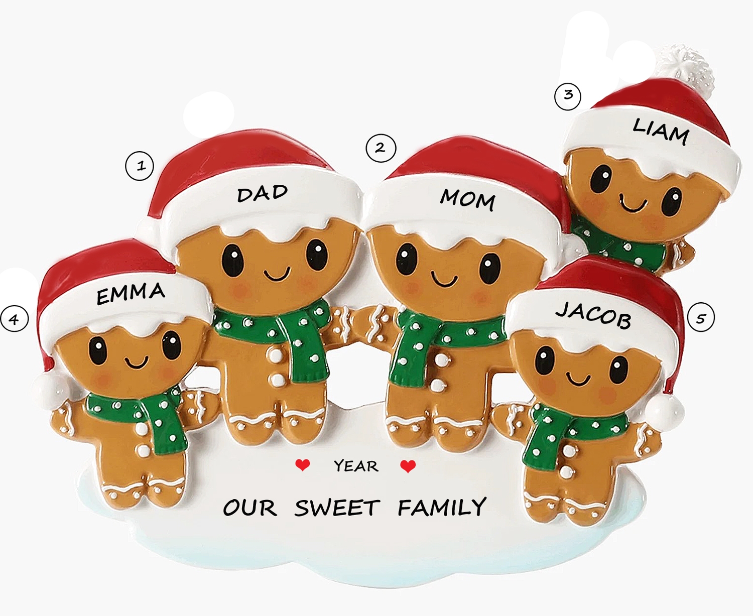 This charming Gingerbread Ornament Family of 5 is a fun Personalized Ornament for a family. Hand painting and a high gloss finish make this high quality ornament bright and sturdy. We hand personalize, creating a thoughtful and unique gift. It's a wonderful present that the entire family will enjoy, for many years to come. This ornament comes with ribbon, ready to hang right out of the package.Size is approximately: 3.5"h x 4"w