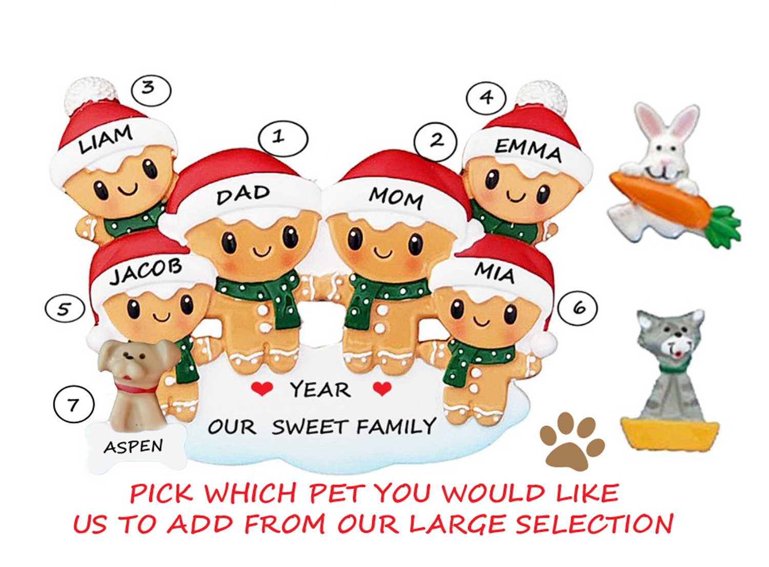 This cute Gingerbread Ornament Family of 6 is a fun Personalized Ornament for a family and their dog or cat. Hand painting and a high gloss finish make this high quality ornament bright and sturdy. We hand personalize, creating a thoughtful and unique gift. It's a wonderful present that the entire family will enjoy, for many years to come. This ornament comes strung on ribbon, ready to hang right out of the package.Size is approximately: 3.5"h x 4.5"w