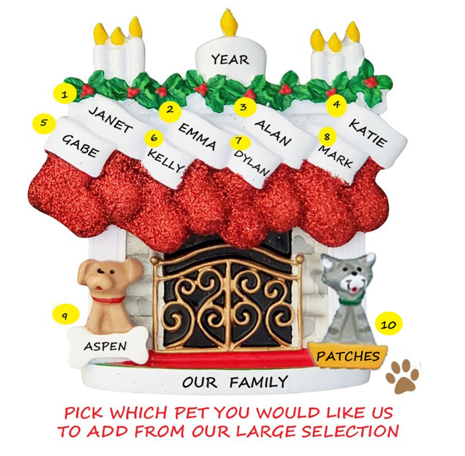 This cozy fireplace Christmas Ornament is a perfect ornament for a Family of 8. We have even included the family pets! Hand painting and a high gloss finish make this high quality ornament bright and sturdy. We hand personalize, creating a thoughtful and unique gift. It's a wonderful present that the entire family will enjoy, for many years to come. This ornament comes strung on ribbon, ready to hang right out of the package.Size is approximately: 3.75"h x 3.5"w