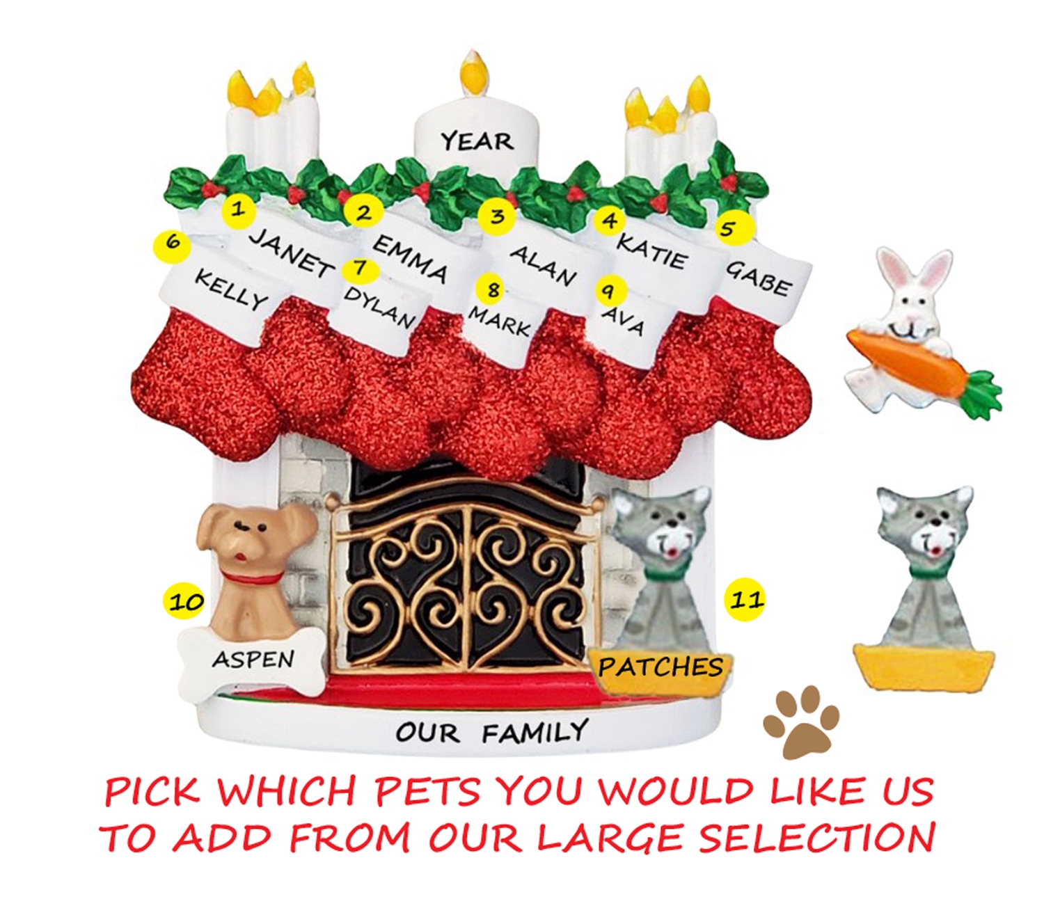 This cozy fireplace Christmas Ornament is a perfect ornament for a Family of 9. We have even included the family pets! Hand painting and a high gloss finish make this high quality ornament bright and sturdy. We hand personalize, creating a thoughtful and unique gift. It's a wonderful present that the entire family will enjoy, for many years to come. This ornament comes strung on ribbon, ready to hang right out of the package.Size is approximately: 3.75"h x 3.5"w