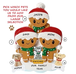 This cute gingerbread family of 3 With 3 Pets personalized Christmas ornament is perfect for a family celebrating Christmas together. Select your custom Pet Style, Choices Pictured Below. Hand painting and a high gloss finish make this high quality ornament bright and sturdy. We hand personalize, creating a thoughtful and unique gift. It's a wonderful present that the entire family will enjoy, for many years to come. This ornament comes strung on red ribbon, ready to hang right out of the package.