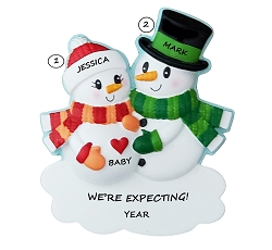 This Expecting Snow Couple personalized Christmas ornament is perfect for a Couple celebrating Christmas and waiting for their new arrival. Hand painting and a high gloss finish make this high quality ornament bright and sturdy. We hand personalize, creating a thoughtful and unique gift. It's a wonderful present that the entire family will enjoy, for many years to come. This ornament comes strung on red ribbon, ready to hang right out of the package.Size is approximately: 3.5"h x 3"w