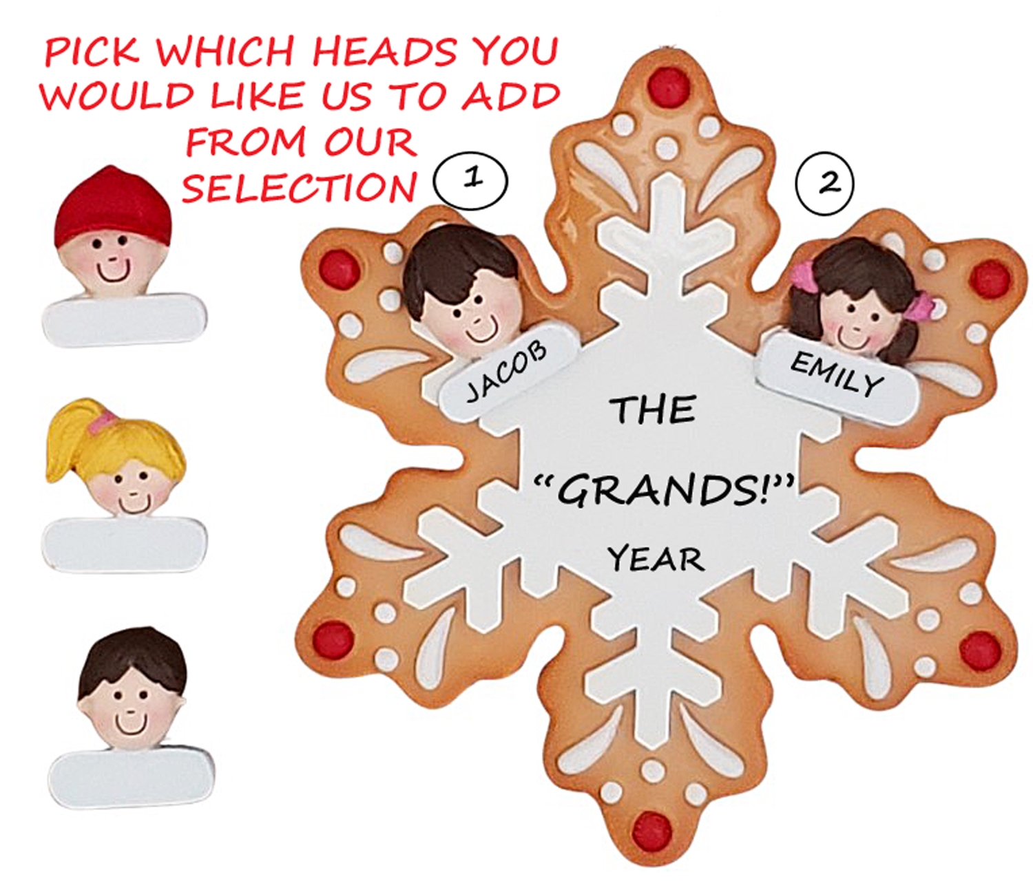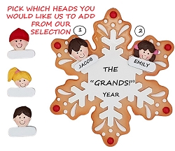 This adorable ornament of 2 grandkids is sure to bring smiles to the grandparents. Hand painting and a high gloss finish make this high quality ornament bright and sturdy. You choose which heads you would like us to add, making this a custom ornament just for you. We hand personalize, creating a thoughtful and unique gift. It's a wonderful present that will be enjoyed for many years to come. Ornament comes with ribbon ready to hang.Size is approximately: 4"h x 4"w