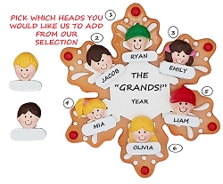 This adorable ornament of 6 grandkids is sure to bring smiles to the grandparents. Hand painting and a high gloss finish make this high quality ornament bright and sturdy. You choose which heads you would like us to add, making this a custom ornament just for you. We hand personalize, creating a thoughtful and unique gift. It's a wonderful present that will be enjoyed for many years to come. Ornament comes with ribbon ready to hang.Size is approximately: 4"h x 4"w