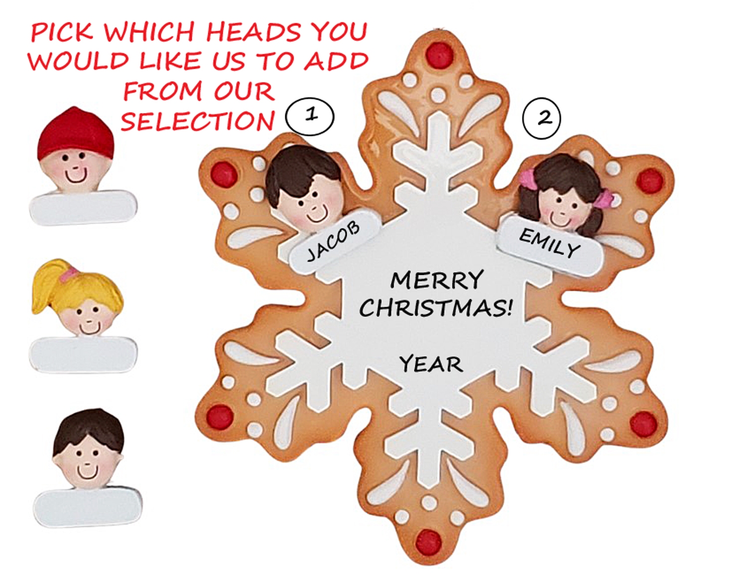 This adorable ornament of 2 people is sure to bring smiles. Hand painting and a high gloss finish make this high quality ornament bright and sturdy. You choose which heads you would like us to add, making this a custom ornament just for you. We hand personalize, creating a thoughtful and unique gift. It's a wonderful present that will be enjoyed for many years to come. Ornament comes with ribbon ready to hang.Size is approximately: 4"h x 4"w
