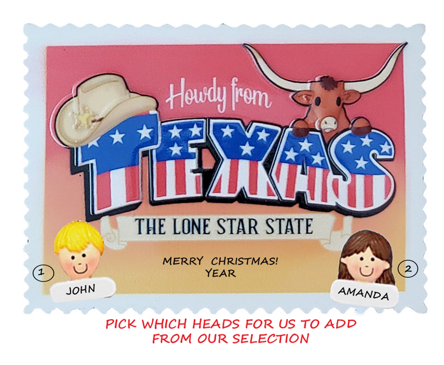 A perfect ornament to remember a special trip to Texas or moving to Texas! We can hand personalize this to make it a souvenir to remember a great time! You can choose which heads you would like us to add making this a custom ornament to treasure for many years. Ornament comes with ribbon ready to hang.