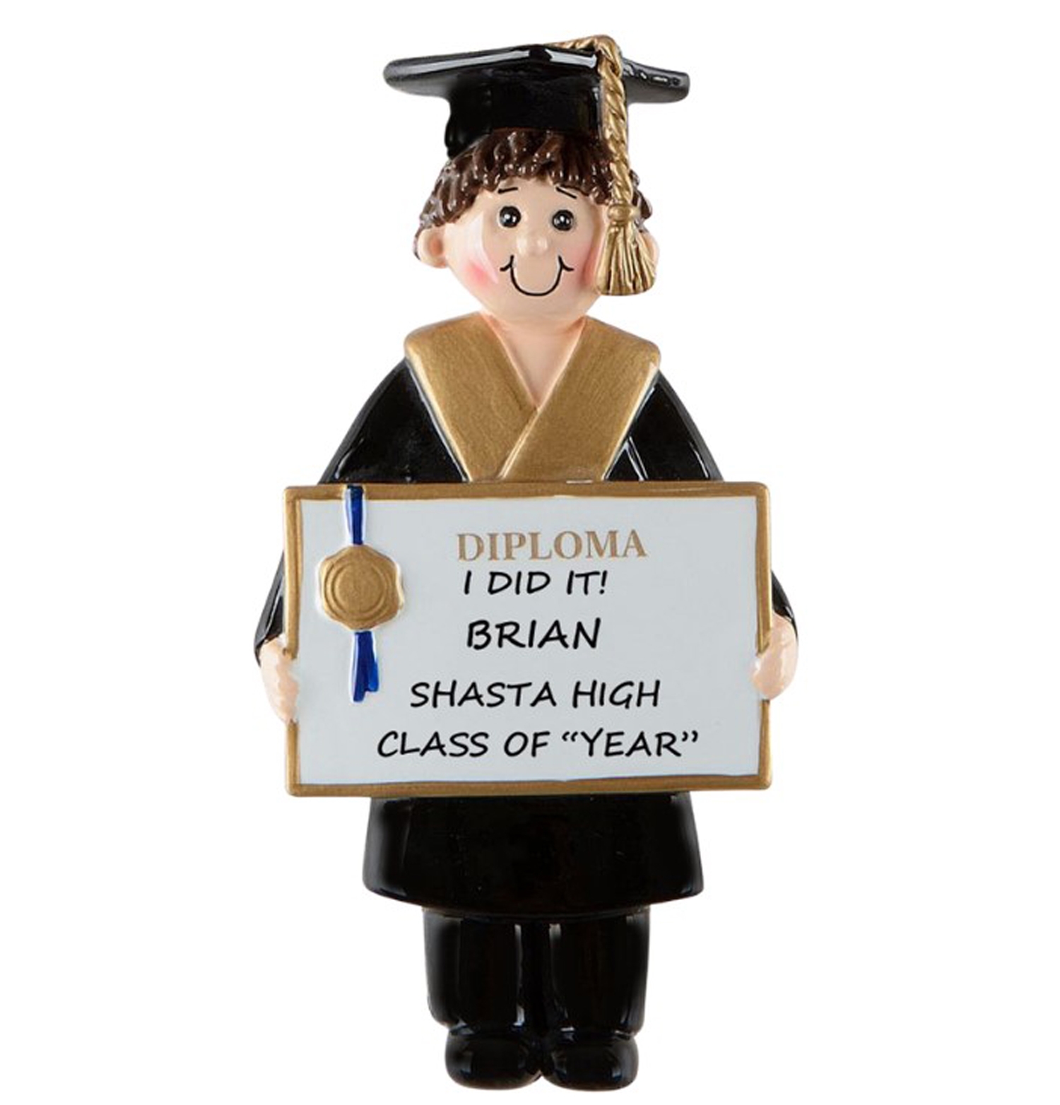A celebration for completing grammar school, high school, or college!  Graduation Ornaments are a perfect gift for graduation and commencement.  A personalized ornament for this special time in life is sure to become a treasure for years to come.  We will be happy to hand write the message you would like on the banner.  Just let us know what you would like and this will become a treasure for many years!  Ornament comes with ribbon ready to hang.