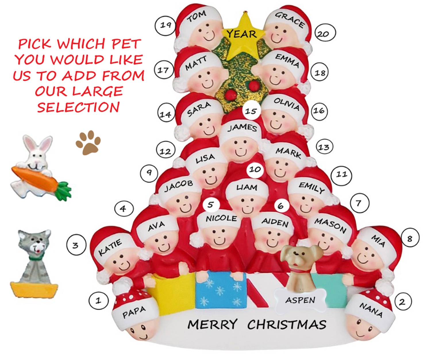 This Merry family of 20 is ready to celebrate A Christmas together! We have even included their pet. A perfect personalized ornament for a family of nineteen that includes their dog, cat, rabbit, bird, hamster or lizard. Ornament comes with ribbon ready to hang.Size is approximately: 5.5"h x 5"w