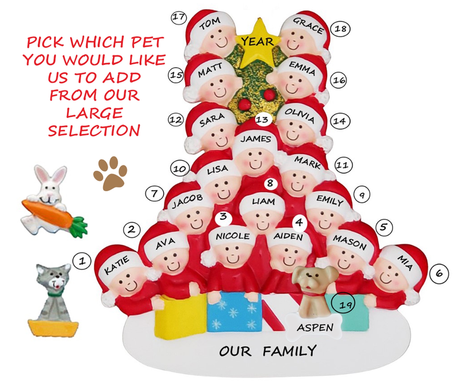 This Merry family of 18 is ready to celebrate A Christmas together! We have even included their pet. A perfect personalized ornament for a family of seventeen that includes their dog, cat, rabbit, bird, hamster or lizard. Ornament comes with ribbon ready to hang.Size is approximately: 5.5"h x 5"w