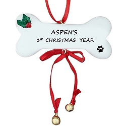 This Personalized Dog Bone ornament is a fun ornament to hang on the tree and be reminded of your furry best friend! We are happy to hand write your dog's name, or any custom writing you would like added. A great gift for a puppy's 1st Christmas.White dog bone is 4.25"w x 1.5"h