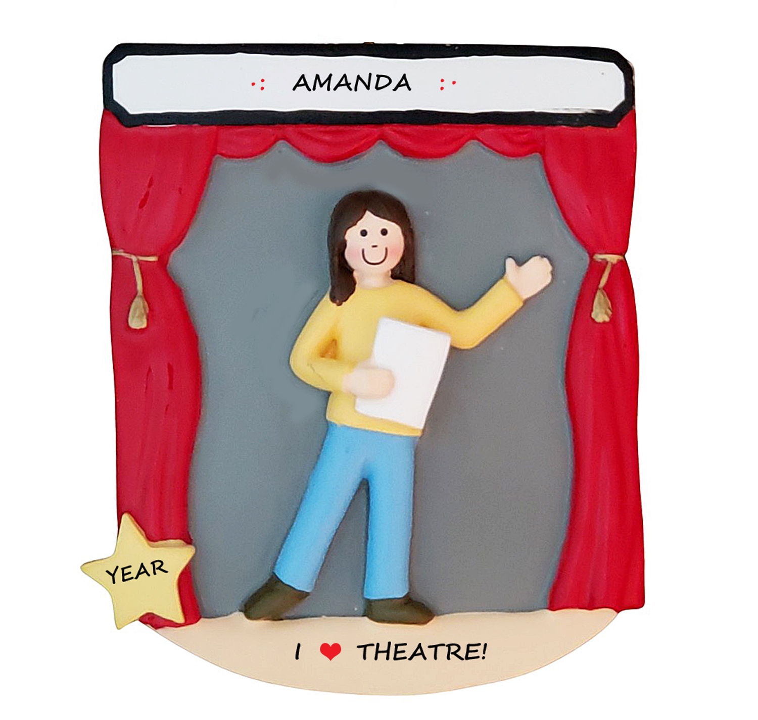 This ornament is perfect for the future star in our lives. We can customize this for the actor or actress that loves the stage. Ornament comes with ribbon ready to hang.Dimensions are approximately 4"H x 3.25"W