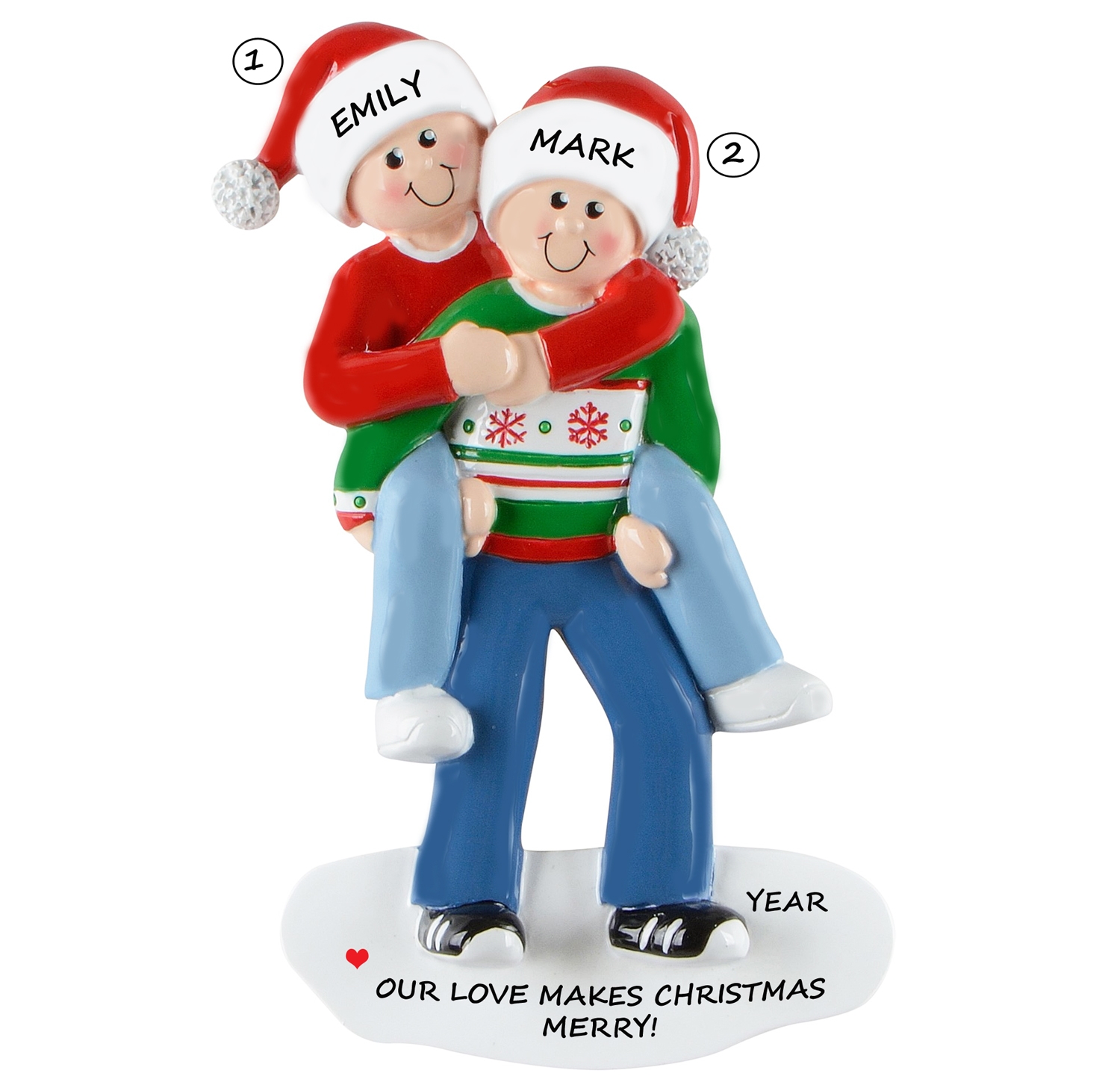This adorable couple is ready to celebrate a special Christmas together. We can hand personalize this to make it a keepsake that will be a part of the Christmas tree for many years. Ornament comes with ribbon ready to hang.