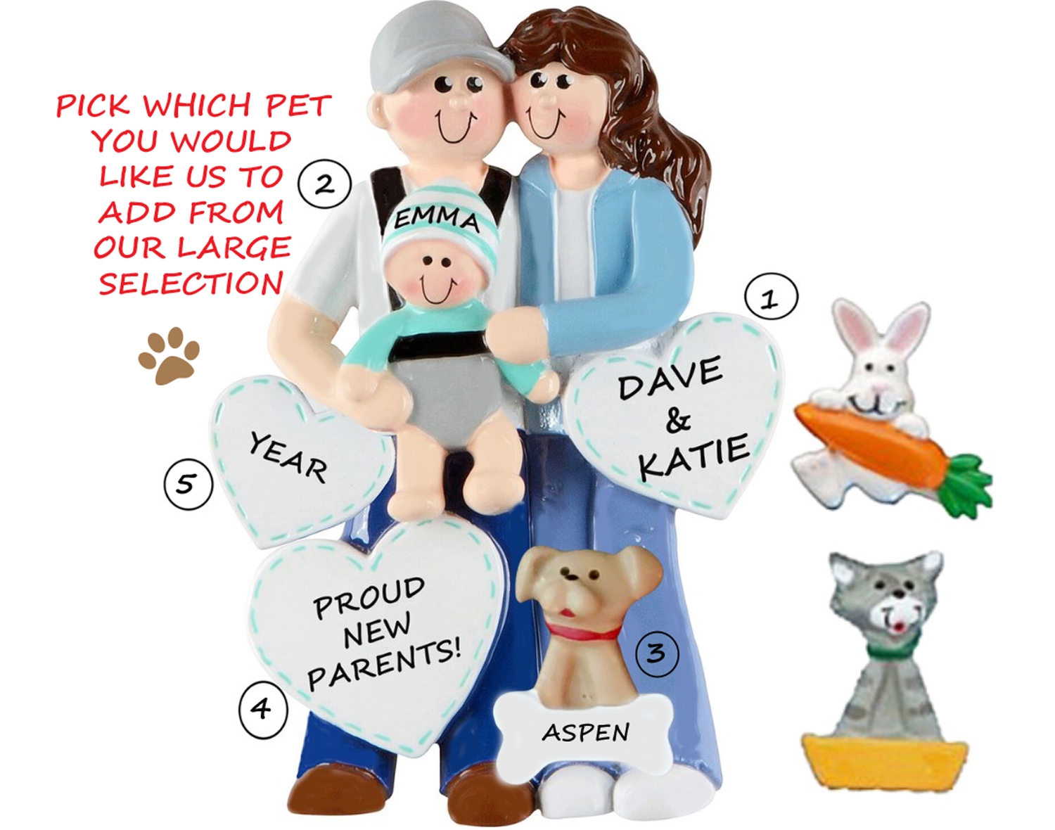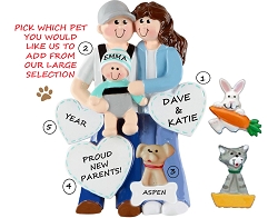 This Proud New Parents With 1 Pet personalized Christmas ornament is perfect for a family celebrating Christmas together. Hand painting and a high gloss finish make this high quality ornament bright and sturdy. We hand personalize, creating a thoughtful and unique gift. It's a wonderful present that the entire family will enjoy for many years to come. This ornament comes strung on red ribbon, ready to hang right out of the package.Size is approximately: 4"h x 2.75"w