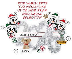 Family of 4 Personalized Ornament with 3 Custom Dogs, Cats or Bunnies Added