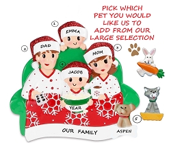Family of Four Personalized Ornament with a Dog, Cat or Bunny added